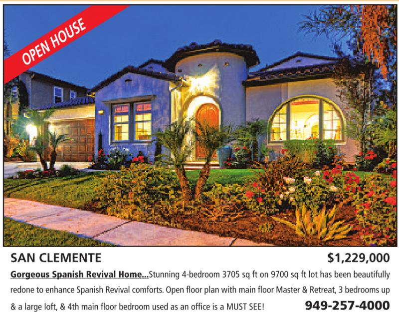 SAN CLEMENTE $1,229,000 Gorgeous Spanish Revival Home...Stunning 4-bedroom 3705 sq ft on 9700 sq ft lot has been beautifully redone to enhance Spanish Revival comforts.Open floor plan with main floor Master &Retreat, 3bedrooms up &alarge loft, &4th main floor bedroom used as an office is aMUST SEE! 949-257-4000