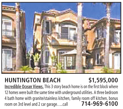 HUNTINGTON BEACH $1,595,000 IncredibleOcean Views. This 3story beach home is on thefirstblock where 12 homeswere builtthe same time with undergroundutilities. Athree bedroom 4bath home with granite/stainless kitchen, family room off kitchen, bonus room on 3rdlevel and 2car garage…..call 714-969-6100