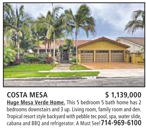 COSTA MESA $ 1,139,000 Huge Mesa Verde Home. This 5bedroom 5bath home has 2 bedrooms downstairsand 3up. Living room,familyroomand den. Tropical resortstyle backyard with pebble tecpool, spa, waterslide, cabana and BBQ and refrigerator. AMust See!714-969-6100