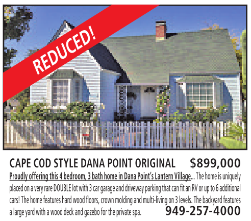 CAPE COD STYLE DANA POINT ORIGINAL $899,000 Proudlyoffering this 4bedroom,3bathhome in Dana Point’s LanternVillage... Thehome is uniquely placedonaveryrareDOUBLElot with 3car garageand driveway parkingthat canfitanRVorupto6additional cars!The home featureshardwood floors, crown molding and multi-living on 3levels.The backyard features alarge yard with awood deck andgazebo for theprivatespa. 949-257-4000