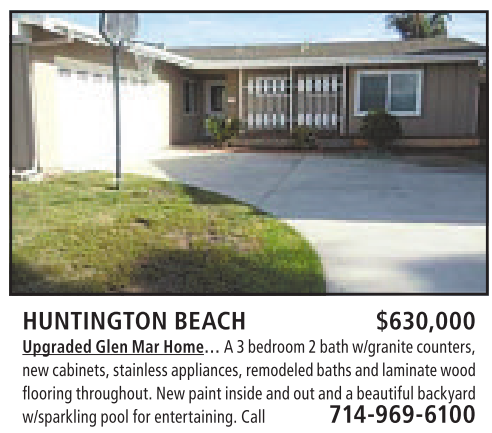 UpgradedGlenMar Home… A3bedroom2bathw/granite counters, new cabinets,stainless appliances, remodeledbaths andlaminatewood flooring throughout.New paint insideand outand abeautifulbackyard w/sparklingpoolfor entertaining. Call 714-969-6100
