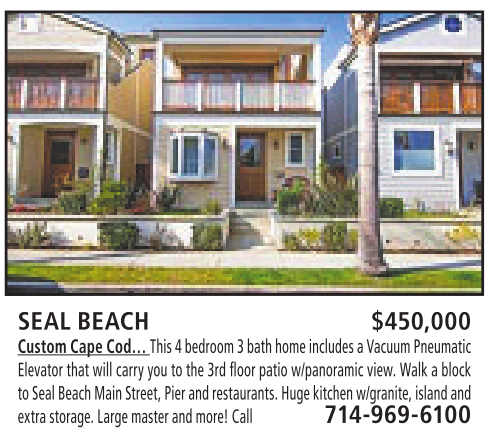 SEAL BEACH $450,000 Custom Cape Cod… This 4bedroom3bathhome includes aVacuum Pneumatic Elevator that will carry you to the 3rd floor patio w/panoramic view. Walk ablock to Seal Beach Main Street,Pierand restaurants. Hugekitchen w/granite,island and extrastorage.Large master and more!Call 714-969-6100