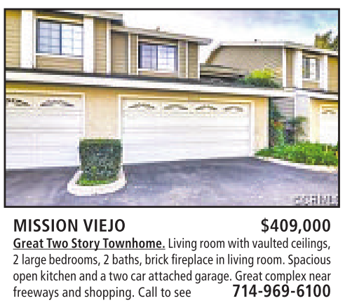 2large bedrooms,2baths,brick fireplace in living room. Spacious openkitchen andatwo carattached garage. Greatcomplex near freewaysand shopping. Call to see 714-969-6100