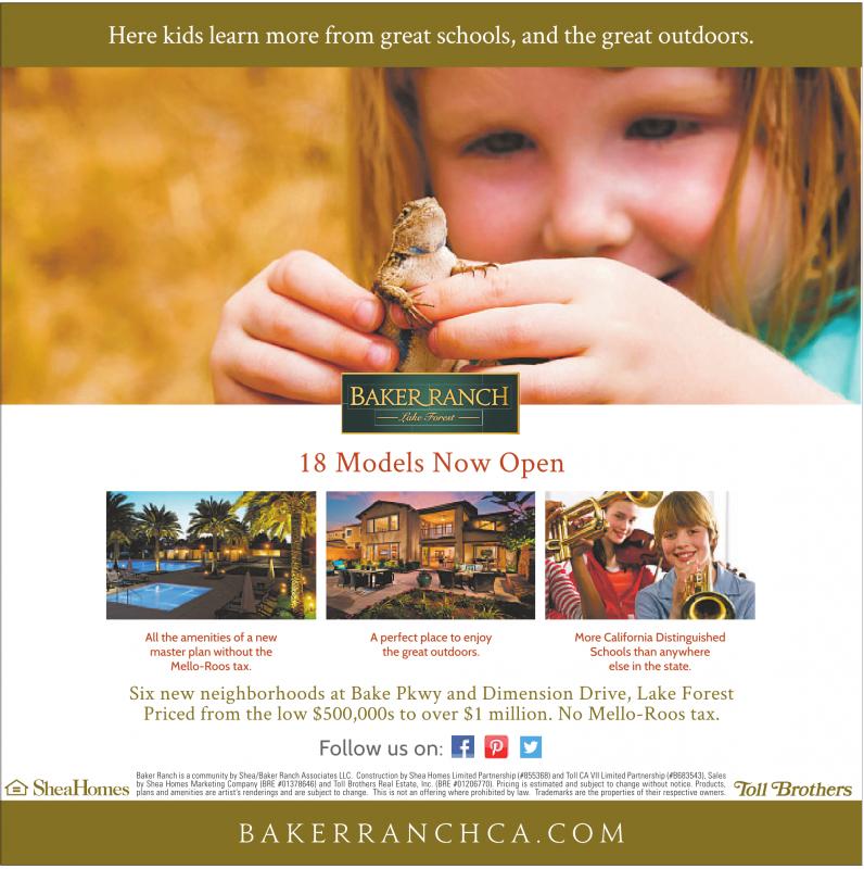 Here kids learn more from great schools, and the great outdoors. 18 Models Now Open All the amenities of a new master plan without the Mello-Roos tax. A perfect place to enjoy the great outdoors. More California Distinguished Schools than anywhere else in the state. Six new neighborhoods at Bake Pkwy and Dimension Drive, Lake Forest Priced from the low $500,000s to over $1 million. No Mello-Roos tax. Follow us on: Baker Ranch is acommunity by Shea/Baker Ranch Associates LLC. Construction by Shea Homes Limited Partnership (#855368) and Toll CA VII Limited Partnership (#B683543), Sales by Shea Homes Marketing Company (BRE #01378646) and Toll Brothers Real Estate, Inc. (BRE #01206770). Pricing is estimated and subject to change without notice. Products, plans and amenities are artist’s renderings and are subject to change. This is not an offering where prohibited by law. Trademarks are the properties of their respective owners. B a k e r R a n c h C A . C O M