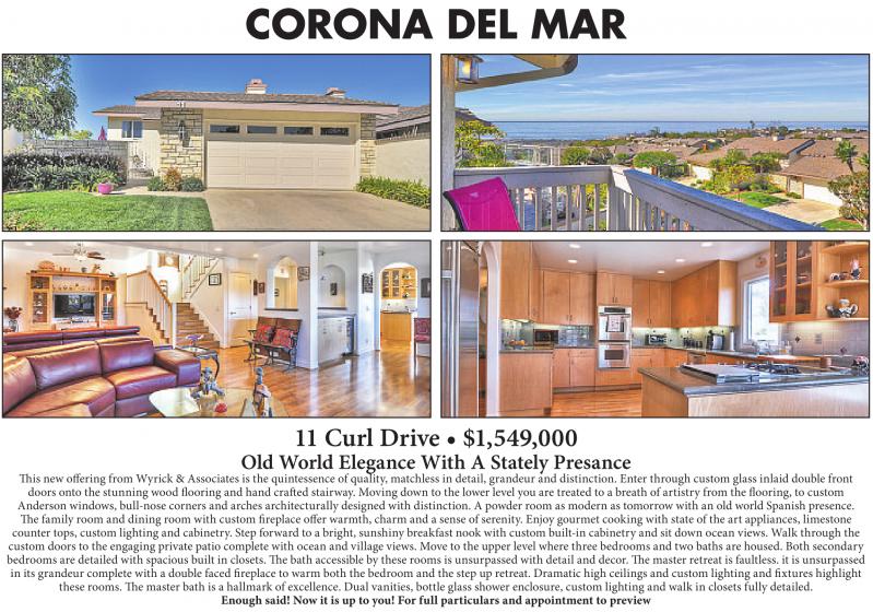 CORONA DEL MAR 11 Curl Drive • $1,549,000 Old World Elegance With A Stately Presance This new offering from Wyrick & Associates is the quintessence of quality, matchless in detail, grandeur and distinction. Enter through custom glass inlaid double front doors onto the stunning wood flooring and hand crafted stairway. Moving down to the lower level you are treated to a breath of artistry from the flooring, to custom Anderson windows, bull-nose corners and arches architecturally designed with distinction. A powder room as modern as tomorrow with an old world Spanish presence. The family room and dining room with custom fireplace offer warmth, charm and a sense of serenity. Enjoy gourmet cooking with state of the art appliances, limestone counter tops, custom lighting and cabinetry. Step forward to a bright, sunshiny breakfast nook with custom built-in cabinetry and sit down ocean views. Walk through the custom doors to the engaging private patio complete with ocean and village views. Move to the upper level where three bedrooms and two baths are housed. Both secondary bedrooms are detailed with spacious built in closets. The bath accessible by these rooms is unsurpassed with detail and decor. The master retreat is faultless. it is unsurpassed in its grandeur complete with a double faced fireplace to warm both the bedroom and the step up retreat. Dramatic high ceilings and custom lighting and fixtures highlight these rooms. The master bath is a hallmark of excellence. Dual vanities, bottle glass shower enclosure, custom lighting and walk in closets fully detailed. Enough said! Now it is up to you! For full particulars and appointment to preview See also