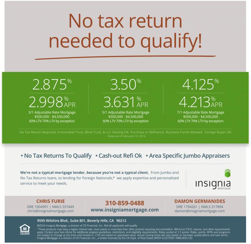 ©2014 Insignia Mortgage, a division of CS Financial, Inc. Not all applicants will qualify. *These products may have ahigher interest rate, more points or more fees than other produts requiring documentation. Minimum FICO, reserve, and other requirements apply. Contact your loan ofÿcer for additional program guidelines, restrictions, and eligibility requirements. Rates quoted at 1.5 points. Rates, points, APRs and programs are subject to change at any time until locked-in. LTVs are based on appraised value. Actual closing times will vary based on borrower qualiÿcations and loan terms. Insignia Mortgage is a division of CS Financial, Inc., a broker licensed by the CA Dept. of Real Estate BRE# 01257559 | NMLS#31132.