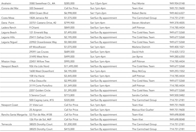 Corona del Mar 320 Seaward Call for Price Sun 1pm-4pm Team Kiwi 949.751.9600 3004 Ocaen Blvd $6,998,000 Sat 11pm-2pm Robert Bents 949.463.6327 Costa Mesa 1828 Jamaica Rd $1,575,000 Sat/Sun By appointment The Carmichael Group 714.751.2181 Dana Point 33751 Castano Drive, #2 $799,900 Sat 1pm-4pm Steven Abraham 949.378.4005 Ladera Ranch 9 Chianti $849,000 Sat/Sun 1pm-4pm Jeff Pittman 714.785.4434 Laguna Beach 121 Emerald Bay $7,495,000 Sat/Sun By appointment The Coté/Vasu Team 949.677.5268 Laguna Hills 25411 Gallup Circle $2,195,000 Sat/Sun By appointment The Coté/Vasu Team 949.677.5268 Laguna Niguel 22902 Oceanbreeze Way $5,580,000 Sat/Sun By appointment The Coté/Vasu Team 949.677.5268 69 Woodhaven $1,075,000 Sat 1pm-4pm Marlene Dietrich 949.400.1021 29391 Las Cruces $689,500 Sat/Sun 1pm-4pm David Holt 714.425.1372 31495 West Nine $499,000 Sun 1pm-4pm Jan Byrne 949.280.6350 Mission Viejo 22451 Willow Tree $995,000 Sat/Sun 1pm-4pm Jeff Pittman 714.785.4434 Newport Beach 926 Via Lido Nord $11,495,000 Sat/Sun By appointment The Coté/Vasu Team 949.677.5268 1608 West Oceanfront $4,195,000 Sun 1pm-4pm Mary McCoy 949.293.1552 108 Via Havre $3,445,000 Sat/Sun 1pm-4pm Jeff Pittman 714.785.4434 4 Rue Deauville $2,995,000 Sat/Sun By appointment The Coté/Vasu Team 949.677.5268 3119 Corte Portofino $1,349,000 Sat/Sun 1pm-4pm Jeff Pittman 714.785.4434 2207 Golden Circle $1,395,000 Sat/Sun By appointment The Coté/Vasu Team 949.677.5268 5 Serena Court $773,800 Sat/Sun By appointment Sandra Carlisle 949.500.0482 500 Cagney Lane, #15 $320,000 Sat/Sun By appointment The Carmichael Group 714.751.2181 Newport Coast 31 Vista Luci Call for Price Sun 1pm-4pm Team Kiwi 949.751.9600 25 Avignon Call for Price Sat/Sun 1pm-4pm Marcus Kiwi Gualter 949.751.9600 Rancho Santa Margarita 52 Flor de Mar, #108 Call for Price Sat/Sun By appointment Team Kiwi 949.698.8048 126 Flor de Sol, #69 Call for Price Sat/Sun By appointment Team Kiwi 949.698.8048 Temecula 38025 Dorothy Court $1,200,000 Sat/Sun By appointment The Carmichael Group 714.751.2181 38025 Dorothy Court $415,000 Sat/Sun By appointment The Carmichael Group 714.751.2181