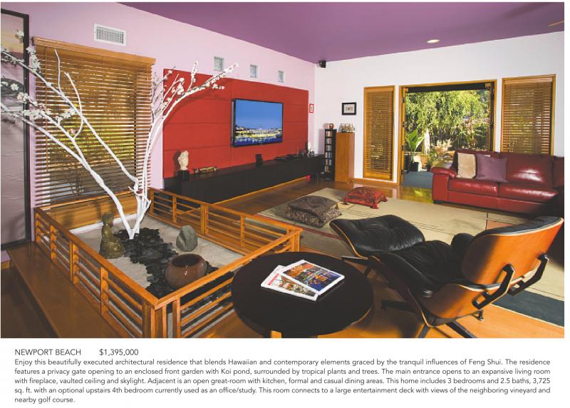 NEWPORT BEACH $1,395,000 Enjoy this beautifully executed architectural residence that blends Hawaiian and contemporary elements graced by the tranquil influences of Feng Shui. The residence features a privacy gate opening to an enclosed front garden with Koi pond, surrounded by tropical plants and trees. The main entrance opens to an expansive living room with fireplace, vaulted ceiling and skylight. Adjacent is an open great-room with kitchen, formal and casual dining areas. This home includes 3 bedrooms and 2.5 baths, 3,725 sq. ft. with an optional upstairs 4th bedroom currently used as an office/study. This room connects to a large entertainment deck with views of the neighboring vineyard and nearby golf course.