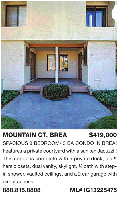 MOUNTAIN CT, BREA $419,000 SPACIOUS 3 BEDROOM/ 3 BA CONDO IN BREA! Features aprivate courtyardwithasunkenJacuzzi!! This condo is complete with a private deck, his &hers closets,dualvanity, skylight, ¾bathwithstepin shower, vaulted ceilings, and a2car garage with direct access. 888.815.8808 ML# IG13225475
