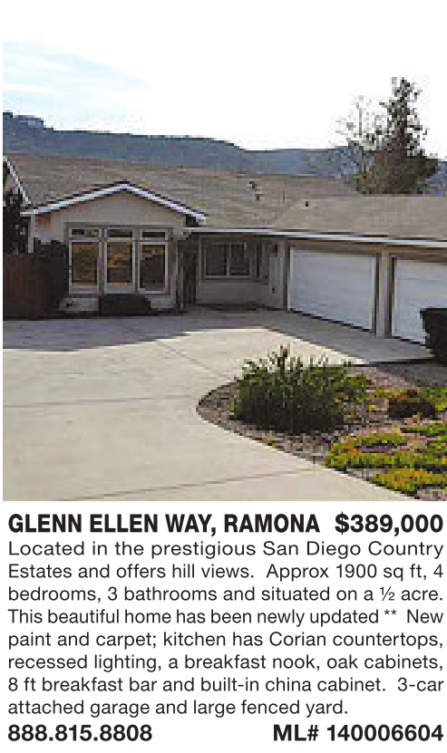 GLENN ELLEN WAY, RAMONA $389,000 Located in the prestigious San Diego Country Estates and offers hill views. Approx 1900 sq ft, 4bedrooms, 3 bathrooms and situated on a ½ acre. This beautifulhome hasbeennewly updated ** New paint and carpet; kitchen has Corian countertops, recessed lighting, a breakfast nook, oak cabinets, 8 ft breakfast bar and built-in china cabinet. 3-car attached garage and large fenced yard. 888.815.8808 ML# 140006604