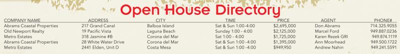 Open House Directory Open House Directory COMPANY NAME ADDRESS CITY TIME PRICE AGENT PHONE# Abrams Coastal Properties 217 Grand Canal Balboa Island Sat &Sun 1:00-4:00 $2,695,000 Don Abrams 714.325.9055 Old Newport Realty 19 Pacific Vista Laguna Beach Sunday 1:00 -4:00 $2,125,000 Marcel Ford 949.887.0236 Metro Estates 318 Jasmine #B Corona del Mar Sat 1:00 -4:00 $1,725,000 Karen Rezek GRI 949.874.1119 Abrams Coastal Properties 28White Water Drive Corona del Mar Sat &Sun 1:00 -4:00 $1,395,000 Ann Moorhead 949.500.1722 Metro Estates 2441 Elden, Unit D Costa Mesa Sat &Sun 1:00 -4:00 $949,950 Andrew Nahin 949.241.5591