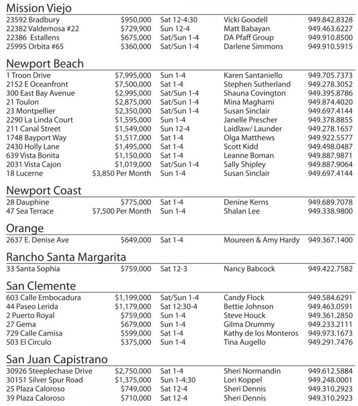 Mission Viejo 23592 Bradbury $950,000 Sat 12-4:30 VickiGoodell 949.842.8328 22382 Valdemosa #22 $729,900 Sun 12-4 Matt Babayan 949.463.6227 22386 Estallens $675,000 Sat/Sun 1-4 DA Pfaff Group 949.910.8500 25995 Orbita #65 $360,000 Sat/Sun 1-4 Darlene Simmons 949.910.5915 Newport Beach 1Troon Drive $7,995,000 Sun 1-4 KarenSantaniello 949.705.7373 2152 EOceanfront $7,500,000 Sat 1-4 Stephen Sutherland 949.278.3052 300 East BayAvenue $2,995,000 Sat/Sun 1-4 Shauna Covington 949.395.8786 21 Toulon $2,875,000 Sat/Sun 1-4 Mina Maghami 949.874.4020 23 Montpellier $2,350,000 Sat/Sun 1-4 Susan Sinclair 949.697.4144 2290 La Linda Court $1,595,000 Sun 1-4 Janelle Prescher 949.378.8855 211 Canal Street $1,549,000 Sun 12-4 Laidlaw/ Launder 949.278.1657 1748 BayportWay $1,517,000 Sat 1-4 Olga Matthews 949.922.5577 2430 Holly Lane $1,495,000 Sat 1-4 Scott Kidd 949.498.0487 639 Vista Bonita $1,150,000 Sat 1-4 Leanne Boman 949.887.9871 2031 Vista Cajon $1,019,000 Sat/Sun 1-4 Sally Shipley 949.887.9064 18 Lucerne $3,850 PerMonth Sun 1-4 Susan Sinclair 949.697.4144 Newport Coast 28 Dauphine $775,000 Sat 1-4 Denine Kerns 949.689.7078 47 SeaTerrace $7,500 PerMonth Sun 1-4 Shalan Lee 949.338.9800 Orange 2637 E. Denise Ave $649,000 Sat 1-4 Moureen &Amy Hardy 949.367.1400 Rancho Santa Margarita 33 Santa Sophia $759,000 Sat 12-3 NancyBabcock 949.422.7582 San Clemente 603 Calle Embocadura $1,199,000 Sat/Sun 1-4 Candy Flock 949.584.6291 44 Paseo Lerida $1,179,000 Sat 12:30-4 Bettie Johnson 949.463.0591 2Puerto Royal $759,000 Sun 1-4 SteveHouck 949.361.2850 27 Gema $679,000 Sun 1-4 Gilma Drummy 949.233.2111 729 Calle Camisa $599,000 Sat 1-4 Kathydelos Monteros 949.973.1673 503 El Circulo $375,000 Sun 1-4 Tina Augello 949.291.7476 San Juan Capistrano 30926 Steeplechase Drive $2,750,000 Sat 1-4 Sheri Normandin 949.612.5884 30151 Silver Spur Road $1,375,000 Sun 1-4:30 Lori Koppel 949.248.0001 25 Plaza Caloroso $749,000 Sat 12-4 Sheri Dennis 949.310.2923 39 Plaza Caloroso $710,000 Sat 12-4 Sheri Dennis 949.310.2923