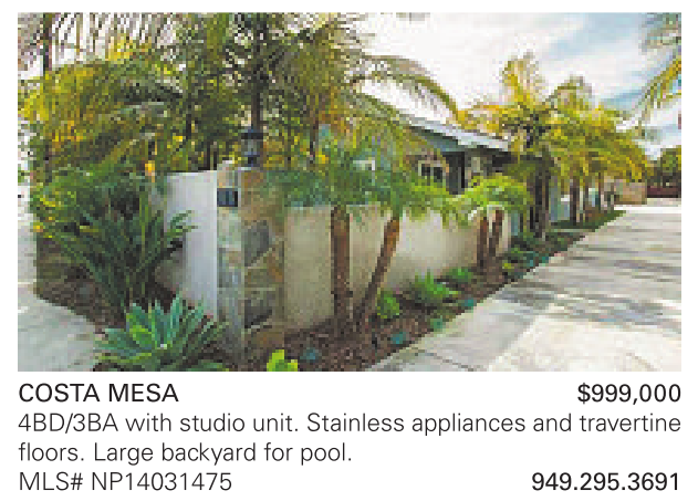 COSTA MESA $999,000 4BD/3BA with studio unit. Stainless appliances and travertine floors. Large backyard for pool. MLS# NP14031475 949.295.3691