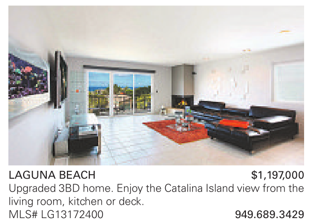 LAGUNA BEACH $1,197,000 Upgraded 3BD home. Enjoythe Catalina Island viewfrom the living room, kitchen or deck. MLS# LG13172400 949.689.3429