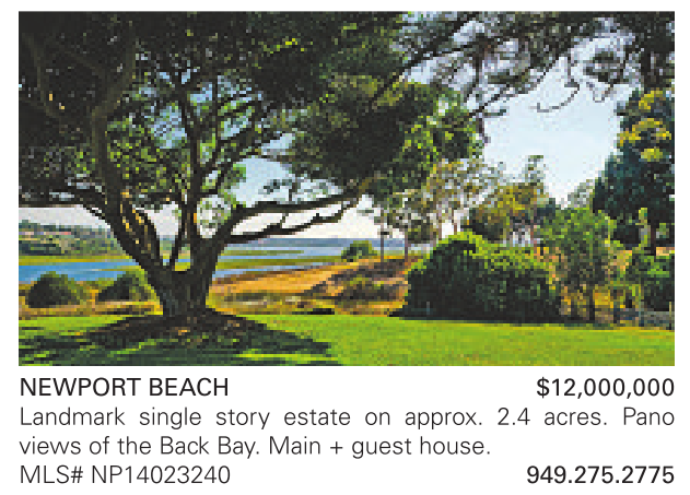 NEWPORT BEACH $12,000,000 Landmark single story estate on approx. 2.4 acres. Pano views of the Back Bay. Main + guest house. MLS# NP14023240 949.275.2775