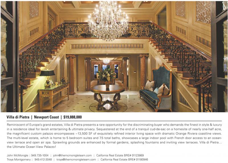 Villa di Pietra | Newport Coast | $19,888,000 Reminiscent of Europe’s grand estates, Villa di Pietra presents a rare opportunity for the discriminating buyer who demands the finest in style & luxury in a residence ideal for lavish entertaining & ultimate privacy. Sequestered at the end of a tranquil cud-de-sac on a homesite of nearly one-half acre, the magnificent custom palazzo encompasses ~13,500 SF of exquisitely refined interior living space with dramatic Orange Riviera coastline views. The multi-level estate, which is home to 5 bedroom suites and 7.5 total baths, showcases a large indoor pool with French door access to an oceanview terrace and open air spa. Sprawling grounds are enhanced by formal gardens, splashing fountains and inviting view terraces. Villa di Pietra… the Ultimate Ocean View Palazzo! John McMonigle :: 949.735-1004 :: john@themcmonigleteam.com :: California Real Estate BRE# 01123869 Troya Montgomery :: 949.412-3048 :: troya@themcmonigleteam.com :: California Real Estate BRE# 01180946