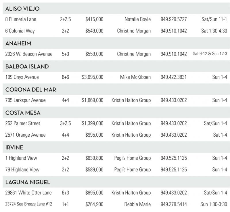 ALISO VIEJO 8Plumeria Lane 2+2.5 $415,000 Natalie Boyle 949.929.5727 Sat/Sun 11-1 6Colonial Way 2+2 $549,000 Christine Morgan 949.910.1042 Sat 1:30-4:30 ANAHEIM 2026 W. Beacon Avenue 5+3 $559,000 Christine Morgan 949.910.1042 Sat 9-12 &Sun 12-3 BALBOAIS ND 109 Onyx Avenue 6+6 $3,695,000 Mike McKibben 949.422.3831 Sun 1-4 CORONA DEL MAR 705 Larkspur Avenue 4+4 $1,869,000 Kristin Halton Group 949.433.0202 Sun 1-4 COSTA MESA 252 Palmer Street 3+2.5 $1,399,000 Kristin Halton Group 949.433.0202 Sat/Sun 1-4 2571 Orange Avenue 4+4 $995,000 Kristin Halton Group 949.433.0202 Sat 1-4 IRVINE 1Highland View 2+2 $639,800 Pegi’sHome Group 949.525.1125 Sun 1-4 79 Highland View 2+2 $589,000 Pegi’sHome Group 949.525.1125 Sun 1-4 GUNA NIGUEL 29861 White Otter Lane 6+3 $895,000 Kristin Halton Group 949.433.0202 Sat/Sun 1-4 23724 Sea Breeze Lane #12 1+1 $264,900 Debbie Marie 949.278.5414 Sun 1:30-3:30