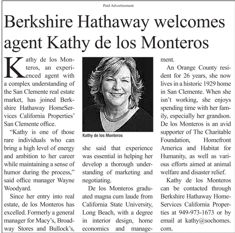 Kathy de los Monteros can be contacted through Berkshire Hathaway Home- Services California Properties at 949-973-1673 or by email at kathy@sochomes. com.