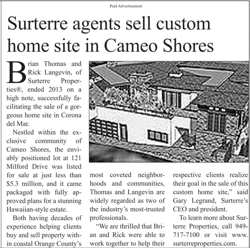 Brian Thomas and Rick Langevin, of Surterre Properties®, ended 2013 on a high note, successfully facilitating the sale of a gorgeous home site in Corona del Mar. Nestled within the exclusive community of Cameo Shores, the enviably positioned lot at 121 Milford Drive was listed for sale at just less than $5.3 million, and it came packaged with fully approved plans for a stunning Hawaiian-style estate. Both having decades of experience helping clients buy and sell property within coastal Orange County’s Paid Advertisement Surterre agents sell custom home site in Cameo Shores most coveted neighborhoods and communities, Thomas and Langevin are widely regarded as two of the industry’s most-trusted professionals. “We are thrilled that Brian and Rick were able to work together to help their respective clients realize their goal in the sale of this custom home site,” said Gary Legrand, Surterre’s CEO and president. To learn more about Surterre Properties, call 949- 717-7100 or visit www. surterreproperties.com. See also