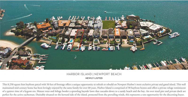 HARBOR ISLAND | NEWPORT BEACH NEWLY LISTED This 8,250 square foot bayfront parcel with 50 feet of frontage offers a unique opportunity to refresh or rebuild on Newport Harbor’s most exclusive private and gated island. This well maintained mid-century home has been lovingly enjoyed by the same family for over 60 years. Harbor Island is comprised of 30 bayfront homes and offers a private refuge reminiscent of a quieter time of a bygone era. Mature trees and foliage border a sprawling bayside lawn that cascades down to a sandy beach and the bay. An over sized pier and private dock are perfect for the active yachtsman. Desirably situated on the leeward side of the island, protected from the prevailing winds, this represents a rare opportunity for the discerning buyer.