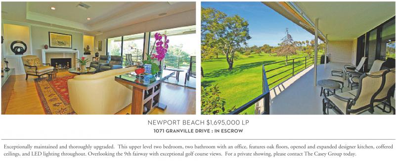 NEWPORT BEACH $1,695,000 LP 1071 GRANVILLE DRIVE : IN ESCROW Exceptionally maintained and thoroughly upgraded. This upper level two bedroom, two bathroom with an office, features oak floors, opened and expanded designer kitchen, coffered ceilings, and LED lighting throughout. Overlooking the 9th fairway with exceptional golf course views. For a private showing, please contact The Casey Group today.
