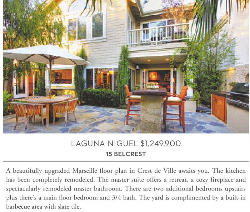LAGUNA NIGUEL $1,249,900 15 BELCREST A beautifully upgraded Marseille floor plan in Crest de Ville awaits you. The kitchen has been completely remodeled. The master suite offers a retreat, a cozy fireplace and spectacularly remodeled master bathroom. There are two additional bedrooms upstairs plus there's a main floor bedroom and 3/4 bath. The yard is complimented by a built-in barbecue area with slate tile.