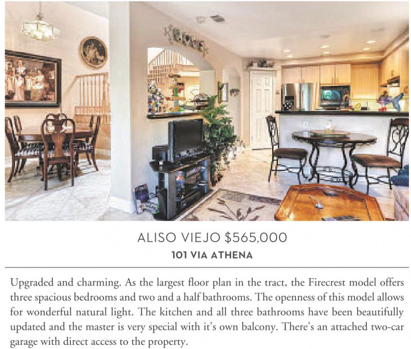 ALISO VIEJO $565,000 101 VIA ATHENA Upgraded and charming. As the largest floor plan in the tract, the Firecrest model offers three spacious bedrooms and two and a half bathrooms. The openness of this model allows for wonderful natural light. The kitchen and all three bathrooms have been beautifully updated and the master is very special with it's own balcony. There's an attached two-car garage with direct access to the property.