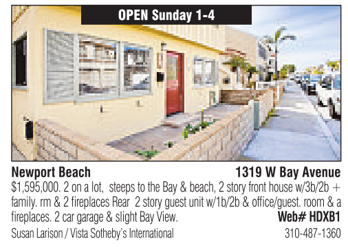 Newport Beach OPEN Sunday 1-4 1319 WBay Avenue Susan Larison /Vista Sotheby’s International 310-487-1360 $1,595,000. 2onalot, steeps to the Bay &beach, 2story front house w/3b/2b + family.rm&2fireplaces Rear 2story guest unit w/1b/2b &office/guest. room &a fireplaces. 2car garage &slight Bay View. Web# HDXB1