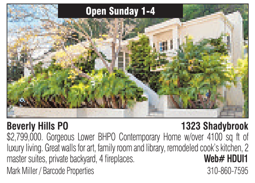 Beverly Hills PO Open Sunday 1-4 1323 Shadybrook Mark Miller /Barcode Properties 310-860-7595 $2,799,000. Gorgeous Lower BHPO Contemporary Home w/over 4100 sq ft of luxury living. Great walls for art, family room and library,remodeled cook’s kitchen, 2 master suites, private backyard, 4fireplaces. Web# HDUI1