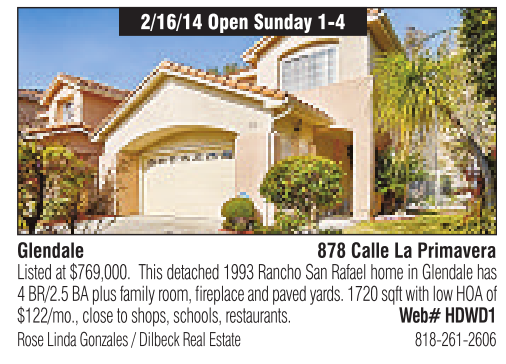 Glendale 2/16/14 Open Sunday 1-4 878 Calle La Primavera Listed at $769,000. This detached 1993 Rancho San Rafael home in Glendale has 4BR/2.5 BA plus family room, fireplace and paved yards. 1720 sqft with low HOA of $122/mo., close to shops, schools, restaurants. Web# HDWD1 Rose Linda Gonzales /Dilbeck Real Estate 818-261-2606