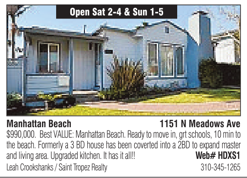 Open Sat 2-4 &Sun 1-5 Manhattan Beach 1151 NMeadows Ave Leah Crookshanks /Saint Tropez Realty 310-345-1265 $990,000. Best VALUE: Manhattan Beach. Ready to move in, grtschools, 10 min to the beach. Formerly a3BDhouse has been coverted into a2BD to expand master and living area. Upgraded kitchen. It has it all!! Web# HDXS1