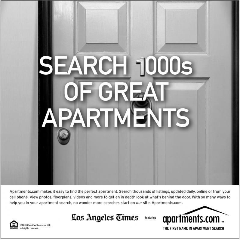 74 SEARCH 000s OF GREAT APARTMENTS Apartments.com makes it easy to find the perfect apartment. Search thousands of listings, updated daily, online or from your cell phone. View photos, floorplans, videos and more to get an in depth look at what’s behind the door. With so many ways to help you in your apartment search, no wonder more searches start on our site, Apartments.com. featuring ©2010 Classified Ventures, LLC. All rights reserved.