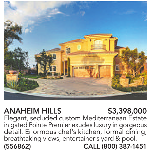 ANAHEIM HILLS $3,398,000 Elegant, secluded custom Mediterranean Estate in gatedPointe Premierexudesluxuryingorgeous detail. Enormous chef’s kitchen, formal dining, breathtakingviews, entertainer’syard&pool. (556862) CALL (800)387-1451