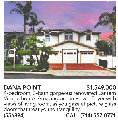 DANA POINT $1,549,000 4-bedroom,3-bathgorgeousrenovated Lantern Village home. Amazing ocean views. Foyer with viewsoflivingroom,asyou gaze at picture glass doorsthat treat youtotranquility. (556894) CALL (714)557-0771