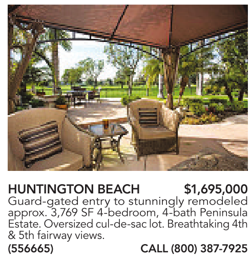 HUNTINGTON BEACH $1,695,000 Guard-gated entry to stunningly remodeled approx. 3,769 SF 4-bedroom, 4-bath Peninsula Estate.Oversized cul-de-saclot.Breathtaking4th &5th fairwayviews. (556665) CALL (800)387-7925