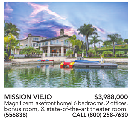 MISSION VIEJO $3,988,000 Magnificentlakefront home!6bedrooms, 2offices, bonus room, & state-of-the-art theater room. (556838) CALL (800)258-7630