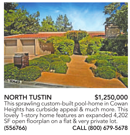 NORTH TUSTIN $1,250,000 This sprawlingcustom-builtpool-home in Cowan Heights has curbside appeal & much more. This lovely 1-story home features an expanded 4,202 SF open floorplan on aflat &veryprivate lot. (556766) CALL (800)679-5678