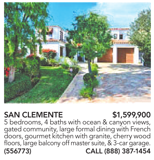 SAN CLEMENTE $1,599,900 5bedrooms, 4baths with ocean&canyonviews, gatedcommunity,largeformaldiningwithFrench doors, gourmet kitchenwithgranite,cherrywood floors, largebalcony offmastersuite,&3-car garage. (556773) CALL (888)387-1454