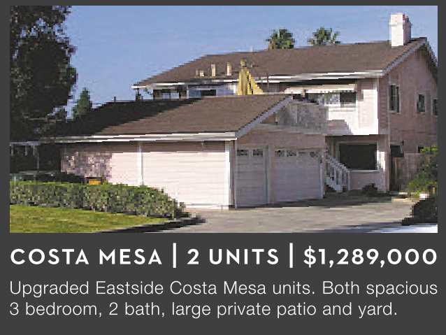 Upgraded Eastside Costa Mesa units. Both spacious 3 bedroom, 2 bath, large private patio and yard.