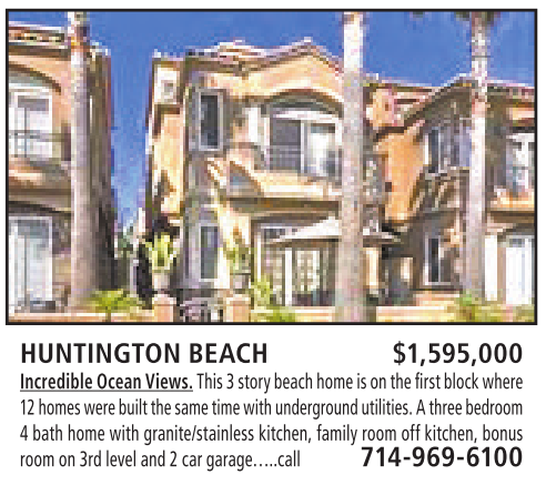 HUNTINGTON BEACH $1,595,000 IncredibleOcean Views. This 3story beach home is on thefirstblock where 12 homeswere builtthe same time with undergroundutilities. Athree bedroom 4bath home with granite/stainless kitchen, family room off kitchen, bonus room on 3rdlevel and 2car garage…..call 714-969-6100