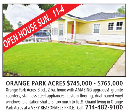 counters, stainless steel appliances, custom flooring, dual-paned vinyl windows,plantationshutters, toomuch to list!! Quaintliving in Orange Park AcresataVERY REASONABLE PRICE. Call 714-482-9100