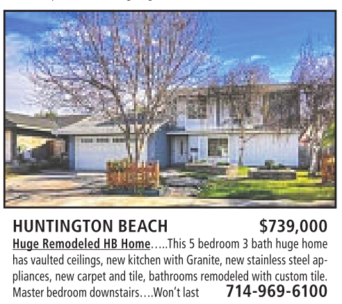 HUNTINGTON BEACH $739,000 Huge Remodeled HBHome…..This 5bedroom 3bath huge home hasvaulted ceilings,new kitchen with Granite,new stainlesssteel appliances, new carpet and tile, bathrooms remodeled with custom tile. Master bedroomdownstairs….Won’t last 714-969-6100