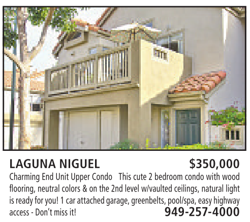 LAGUNA NIGUEL $350,000 Charming End Unit Upper Condo This cute 2bedroom condo with wood flooring, neutral colors &onthe 2nd level w/vaulted ceilings, natural light is readyfor you! 1car attachedgarage, greenbelts, pool/spa, easy highway access -Don’t miss it! 949-257-4000
