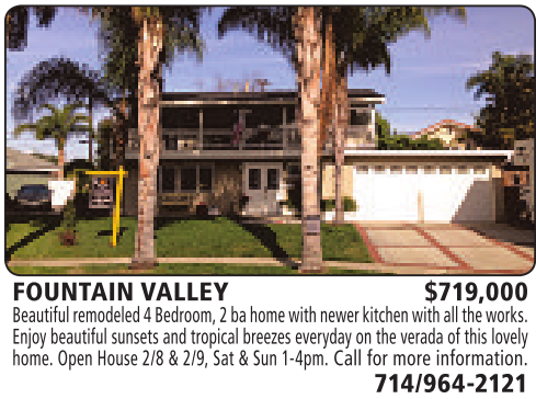 FOUNTAIN VALLEY $719,000 Beautifulremodeled4Bedroom, 2bahome with newer kitchen with allthe works. Enjoy beautiful sunsets and tropical breezes everyday on the verada of this lovely home. Open House 2/8 &2/9, Sat &Sun 1-4pm. Call for more information. 714/964-2121