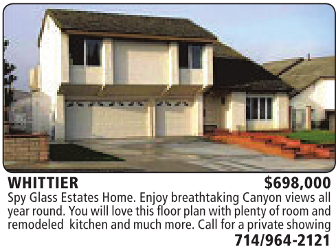 WHITTIER $698,000 SpyGlass EstatesHome.Enjoy breathtakingCanyonviews all year round. Youwill love this floorplanwithplentyofroomand remodeled kitchen andmuchmore.Callfor aprivateshowing 714/964-2121