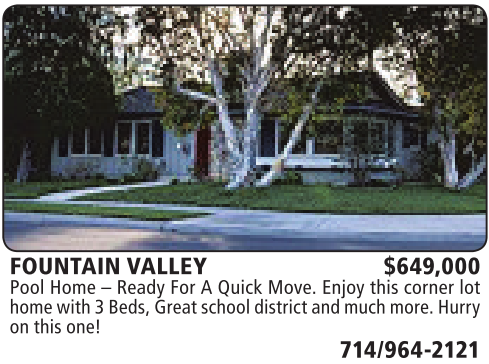 FOUNTAIN VALLEY $649,000 Pool Home –Ready For AQuick Move. Enjoy this corner lot home with 3Beds, Greatschool district andmuchmore.Hurry on this one!