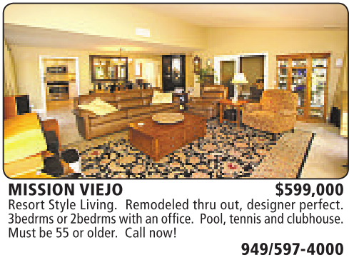 MISSION VIEJO $599,000 Resort Style Living. Remodeled thru out, designer perfect. 3bedrmsor2bedrms with an office. Pool,tennis andclubhouse. Must be 55 or older. Call now!