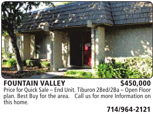 FOUNTAIN VALLEY $450,000 Pricefor QuickSale–End Unit.Tiburon 2Bed/2Ba –OpenFloor plan. Best Buy for the area. Call us for more Information on this home.