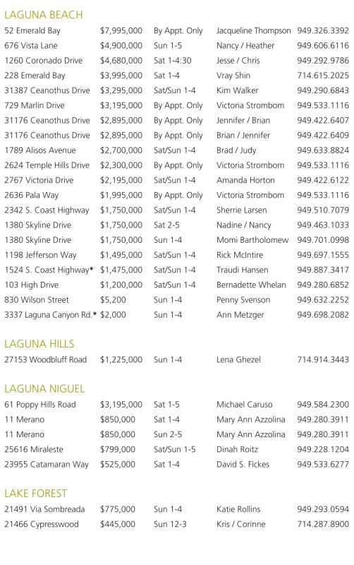 52 Emerald Bay $7,995,000 By Appt. Only Jacqueline Thompson 949.326.3392 676 Vista Lane $4,900,000 Sun 1-5 Nancy / Heather 949.606.6116 1260 Coronado Drive $4,680,000 Sat 1-4:30 Jesse / Chris 949.292.9786 228 Emerald Bay $3,995,000 Sat 1-4 Vray Shin 714.615.2025 31387 Ceanothus Drive $3,295,000 Sat/Sun 1-4 Kim Walker 949.290.6843 729 Marlin Drive $3,195,000 By Appt. Only Victoria Strombom 949.533.1116 31176 Ceanothus Drive $2,895,000 By Appt. Only Jennifer / Brian 949.422.6407 31176 Ceanothus Drive $2,895,000 By Appt. Only Brian / Jennifer 949.422.6409 1789 Alisos Avenue $2,700,000 Sat/Sun 1-4 Brad / Judy 949.633.8824 2624 Temple Hills Drive $2,300,000 By Appt. Only Victoria Strombom 949.533.1116 2767 Victoria Drive $2,195,000 Sat/Sun 1-4 Amanda Horton 949.422.6122 2636 Pala Way $1,995,000 By Appt. Only Victoria Strombom 949.533.1116 2342 S. Coast Highway $1,750,000 Sat/Sun 1-4 Sherrie Larsen 949.510.7079 1380 Skyline Drive $1,750,000 Sat 2-5 Nadine / Nancy 949.463.1033 1380 Skyline Drive $1,750,000 Sun 1-4 Momi Bartholomew 949.701.0998 1198 Jefferson Way $1,495,000 Sat/Sun 1-4 Rick McIntire 949.697.1555 1524 S. Coast Highway* $1,475,000 Sat/Sun 1-4 Traudi Hansen 949.887.3417 103 High Drive $1,200,000 Sat/Sun 1-4 Bernadette Whelan 949.280.6852 830 Wilson Street $5,200 Sun 1-4 Penny Svenson 949.632.2252 3337 Laguna Canyon Rd.* $2,000 Sun 1-4 Ann Metzger 949.698.2082