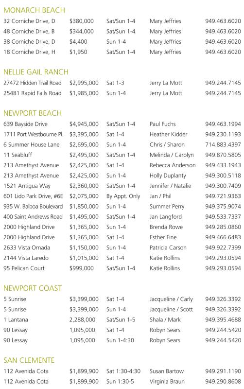 639 Bayside Drive $4,945,000 Sat/Sun 1-4 Paul Fuchs 949.463.1994 1711 Port Westbourne Pl. $3,395,000 Sat 1-4 Heather Kidder 949.230.1193 6 Summer House Lane $2,695,000 Sun 1-4 Chris / Sharon 714.883.4397 11 Seabluff $2,495,000 Sat/Sun 1-4 Melinda / Carolyn 949.870.5805 213 Amethyst Avenue $2,425,000 Sat 1-4 Rebecca Anderson 949.433.1943 213 Amethyst Avenue $2,425,000 Sun 1-4 Holly Duplanty 949.300.5118 1521 Antigua Way $2,360,000 Sat/Sun 1-4 Jennifer / Natalie 949.300.7409 601 Lido Park Drive, #6E $2,075,000 By Appt. Only Jan / Phil 949.721.9363 935 W. Balboa Boulevard $1,850,000 Sun 1-4 Summer Perry 949.375.9074 400 Saint Andrews Road $1,495,000 Sat/Sun 1-4 Jan Langford 949.533.7337 2000 Highland Drive $1,365,000 Sun 1-4 Brenda Rowe 949.285.0860 2000 Highland Drive $1,365,000 Sat 1-4 Esther Fine 949.466.6483 2633 Vista Ornada $1,150,000 Sun 1-4 Patricia Carson 949.922.7399 2144 Vista Laredo $1,015,000 Sat 1-4 Katie Rollins 949.293.0594 95 Pelican Court $999,000 Sat/Sun 1-4 Katie Rollins 949.293.0594
